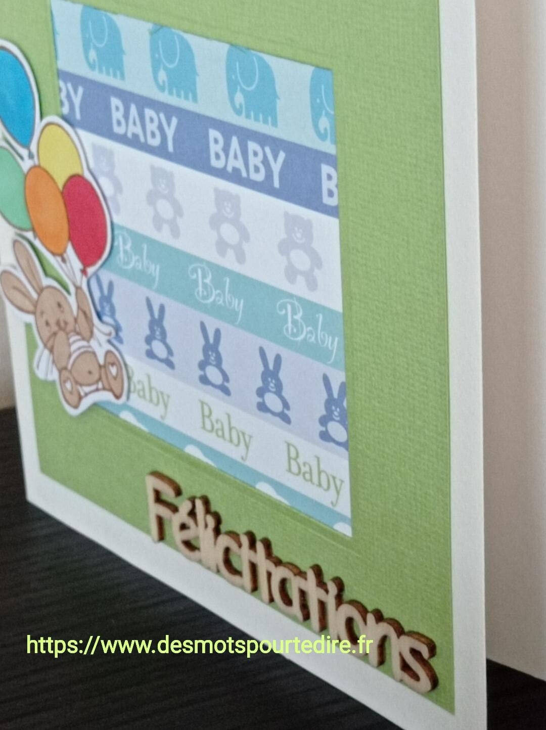 #carte #carterie artisanale #homemade #fait-main #lapin #ballons #félicitations #bois #scrapbooking #baby #bleu #naissance #desmotspourtedire